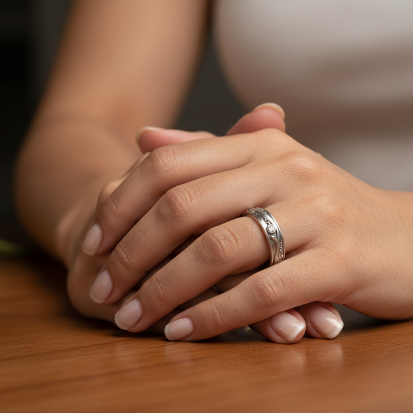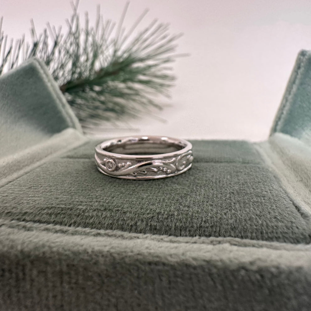 Bostonian Vines Band: Designed inspired by the fluid journey through nature. Includes 3 diamonds bezel set around within the pattern .05 ct total weight. The band measures 4.50mm wide and finished with a sandblast and polished techniques. 14k white gold is available for immediate delivery or in-store pick up.