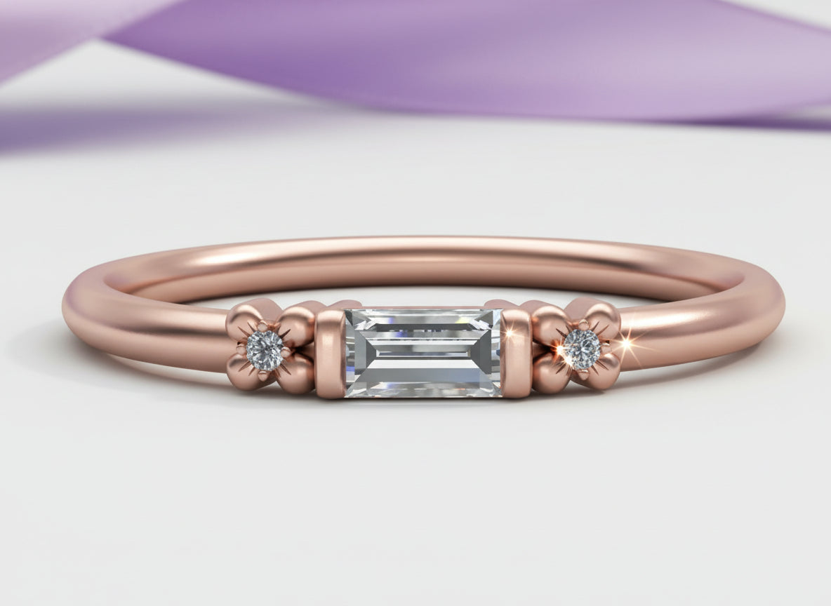 Our dainty baguette band was created with our signature low profile for stacking along side other rings in your collection or wear alone for a sophisticated look. Created in 14k rose gold with a stunning baguette diamond bar set in the center.