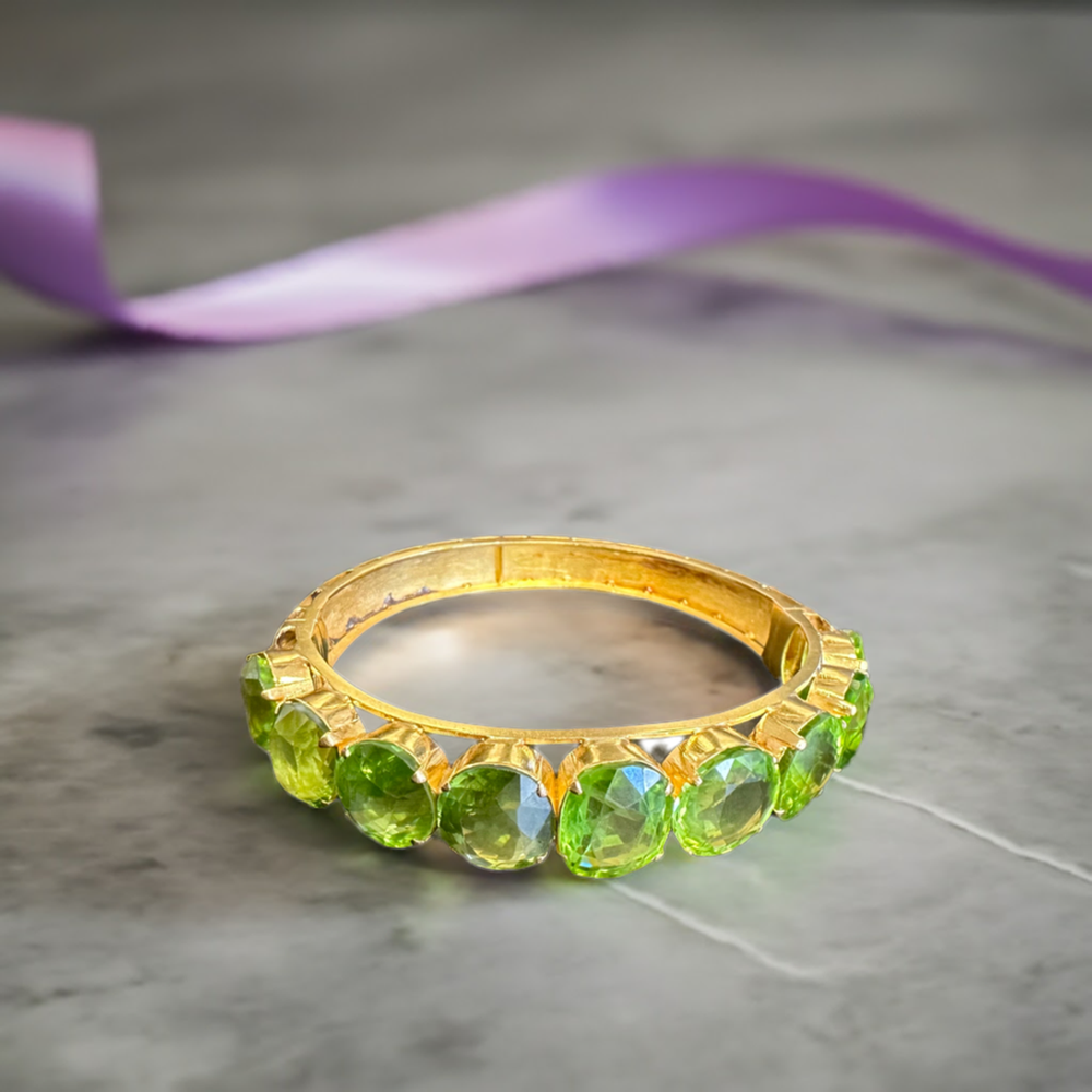 Along the top are 9 antique cut, vibrant green peridot stones weighing approximately 50 carats total weight. Set within the rich yellow gold, the stone pop and sparkle, making this piece a standout accessory.